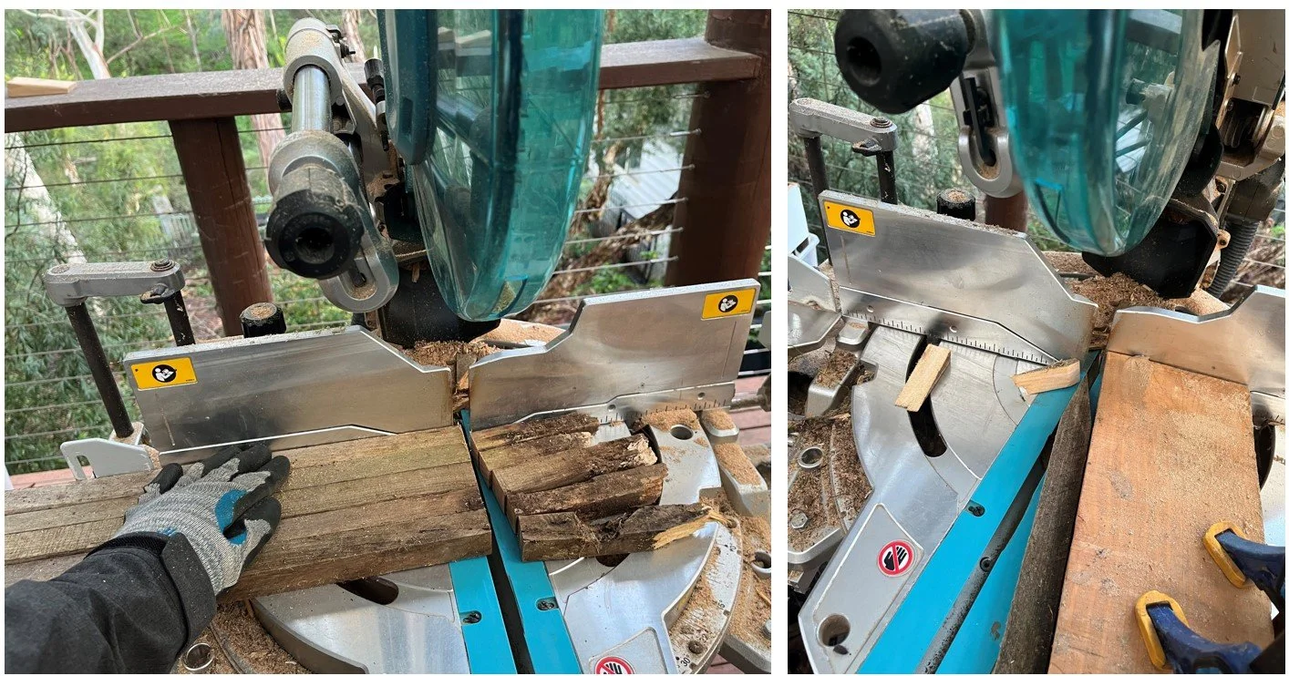 Photo above left: A drop-saw is firstly used to trim the rotten ends off of the stakes. Four or five stakes can be trimmed comfortably in one cut which makes the process quicker. The photo to the right shows the next step, which is to re-cut the point. The point makes it easier to drive the stakes into the ground. This is done by setting the cutting angle to about 12 degrees and clamping a guide board offset from this angle to allow the stake to be held securely while cutting. Two cuts are required to get a good point in the center of the stake.